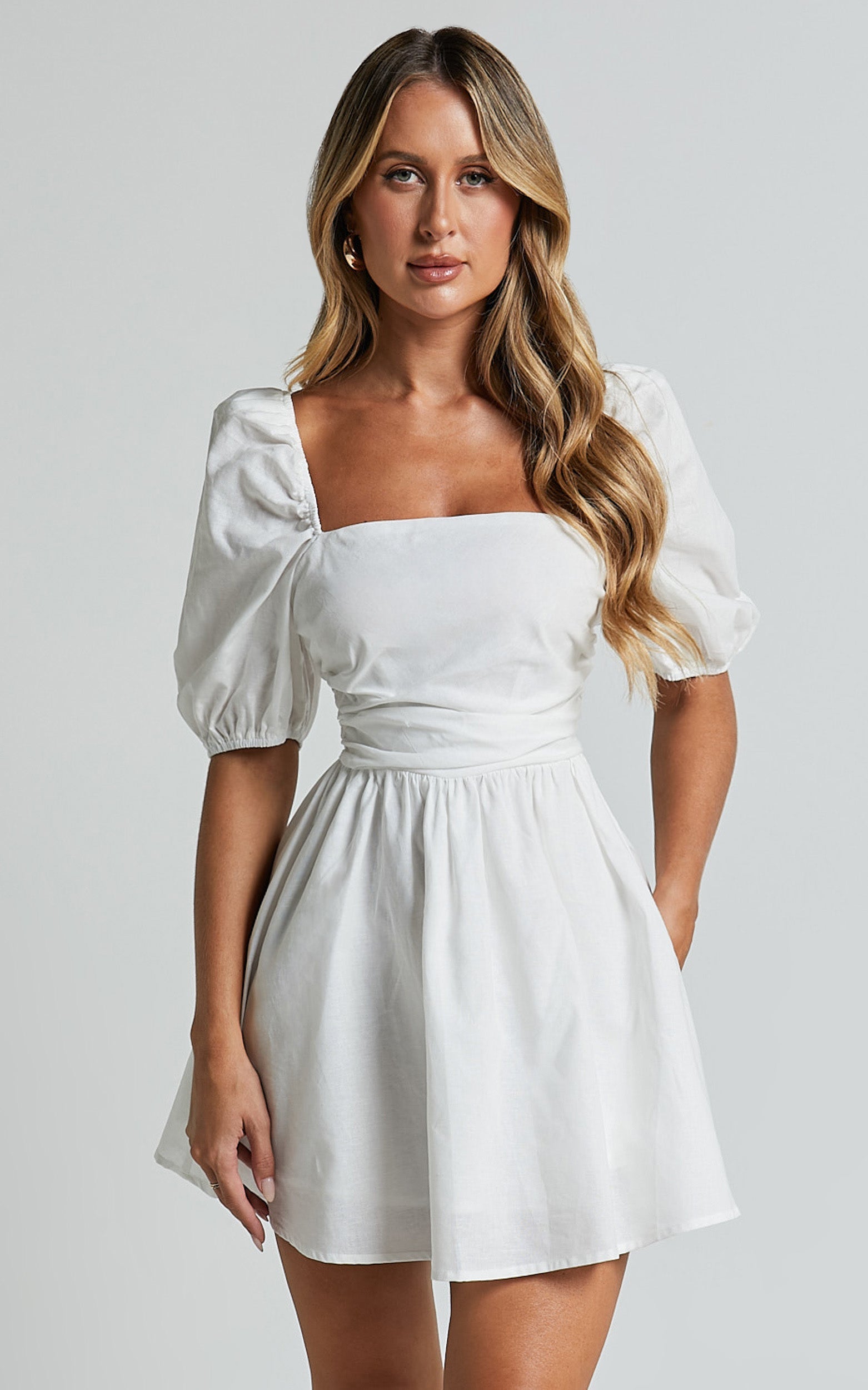 Linen Look Puff Sleeve Ruched Bodice Dress in White