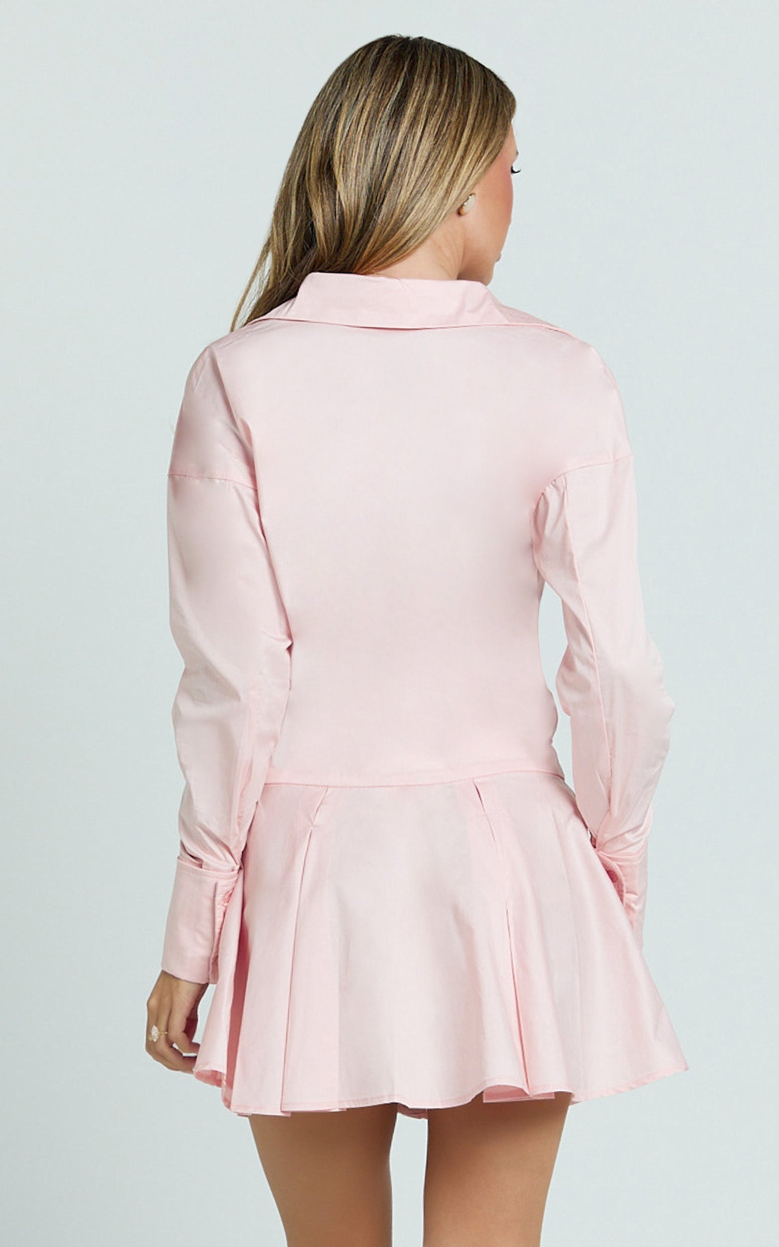 Collared Long Sleeve Button Front Dropped Waist Dress in Pink